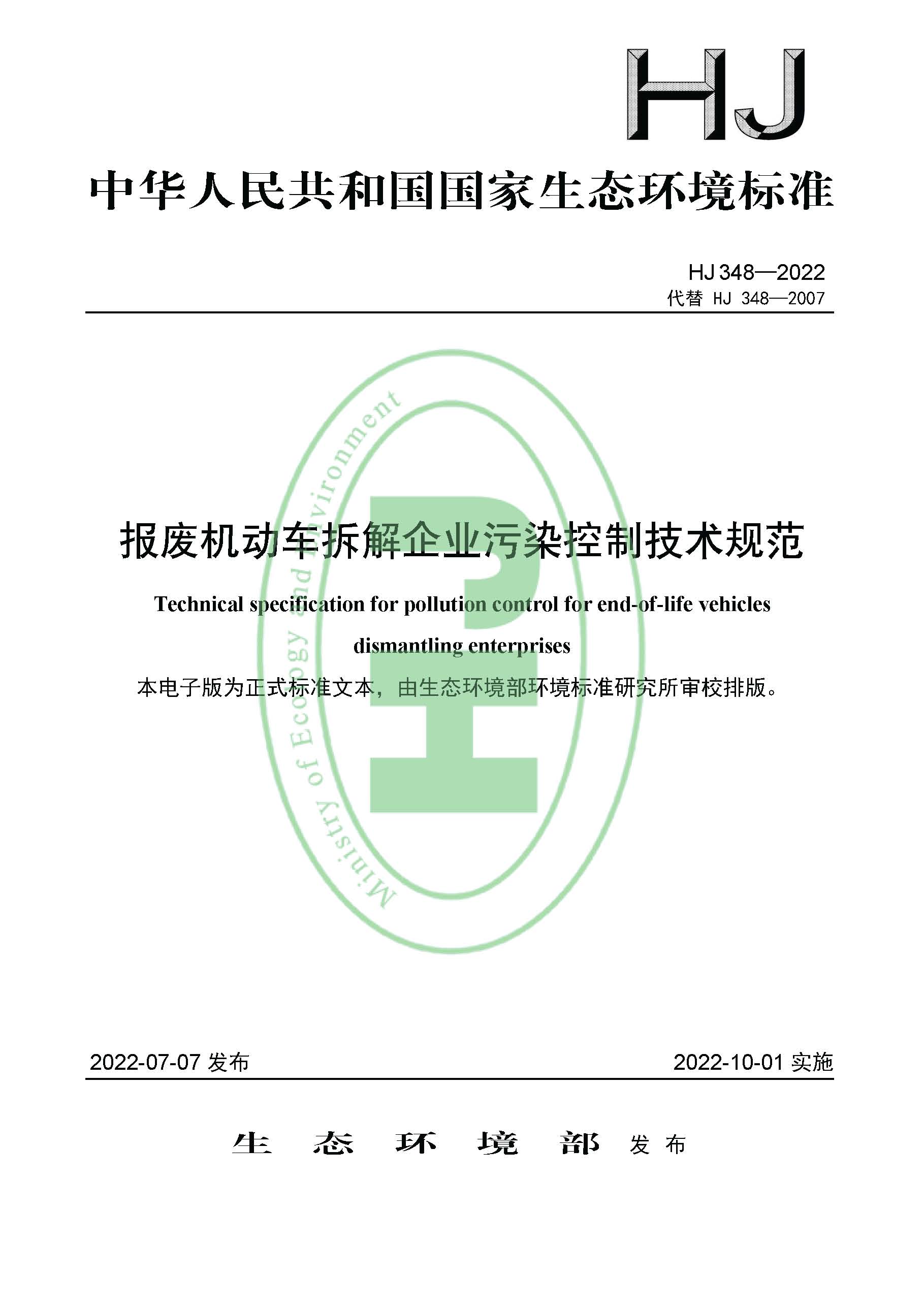 為貫徹《中華人民共和國環(huán)境保護(hù)法》《中華人民共和國固體廢物污染環(huán)境防治法》《報(bào)廢機(jī)動(dòng)車回收管理辦法》等法律法規(guī),防治報(bào)廢機(jī)動(dòng)車拆解過程的環(huán)境污染,規(guī)范報(bào)廢機(jī)動(dòng)車拆解環(huán)境管理工作,制定本標(biāo)準(zhǔn)。本標(biāo)準(zhǔn)規(guī)定了報(bào)廢機(jī)動(dòng)車拆解總體要求,企業(yè)基礎(chǔ)設(shè)施和拆解過程污染控制要求,污染物排放要求,環(huán)境管理要求以及環(huán)境監(jiān)測與突發(fā)環(huán)境事件應(yīng)急預(yù)案要求。本標(biāo)準(zhǔn)首次發(fā)布于 2007 年,本次是對(duì)《報(bào)廢機(jī)動(dòng)車拆解環(huán)境保護(hù)技術(shù)規(guī)范》(HJ 348—2007)的第一次修訂。