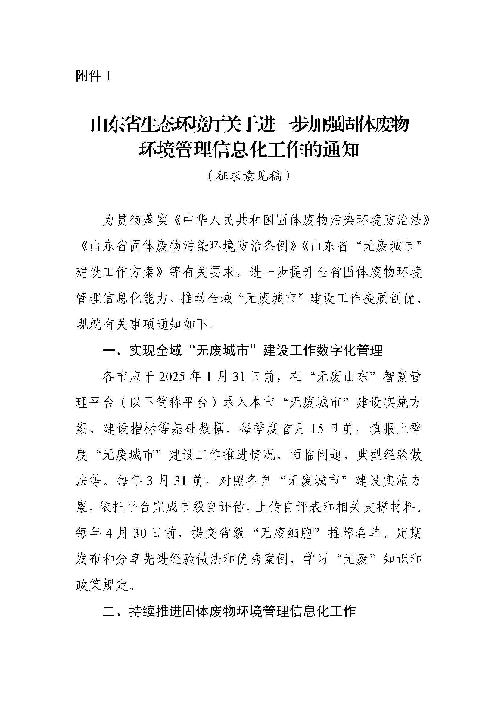 為貫徹落實(shí)《中華人民共和國(guó)固體廢物污染環(huán)境防治法》《山東省固體廢物污染環(huán)境防治條例》《山東省“無(wú)廢城市”建設(shè)工作方案》等有關(guān)要求,進(jìn)一步提升全省固體廢物環(huán)境管理信息化能力,推動(dòng)全域“無(wú)廢城市”建設(shè)工作,我廳組織起草了《關(guān)于進(jìn)一步加強(qiáng)固體廢物環(huán)境管理信息化工作的通知(征求意見(jiàn)稿)》,現(xiàn)公開(kāi)征求意見(jiàn),有關(guān)意見(jiàn)請(qǐng)于2024年12月27日前反饋至聯(lián)系人郵箱。